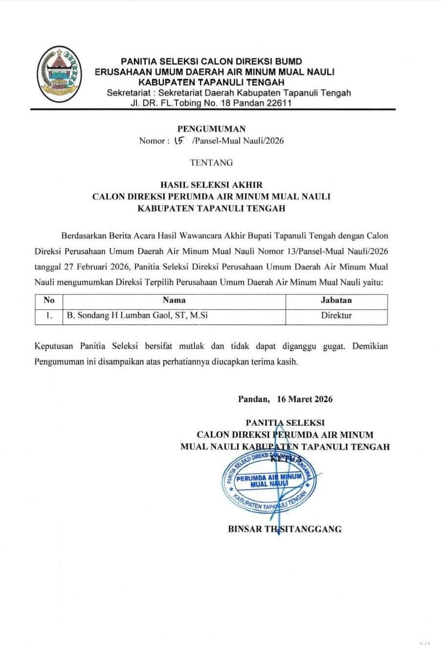 kantongberita.com, TAPTENG | Meski melanggar syarat pencalonan, Pemerintah Kabupaten Tapanuli Tengah menetapkan Eks terpidana korupsi sebagai Direksi Perusahaan Umum Daerah (Perumda) Air Minum Mual Na...